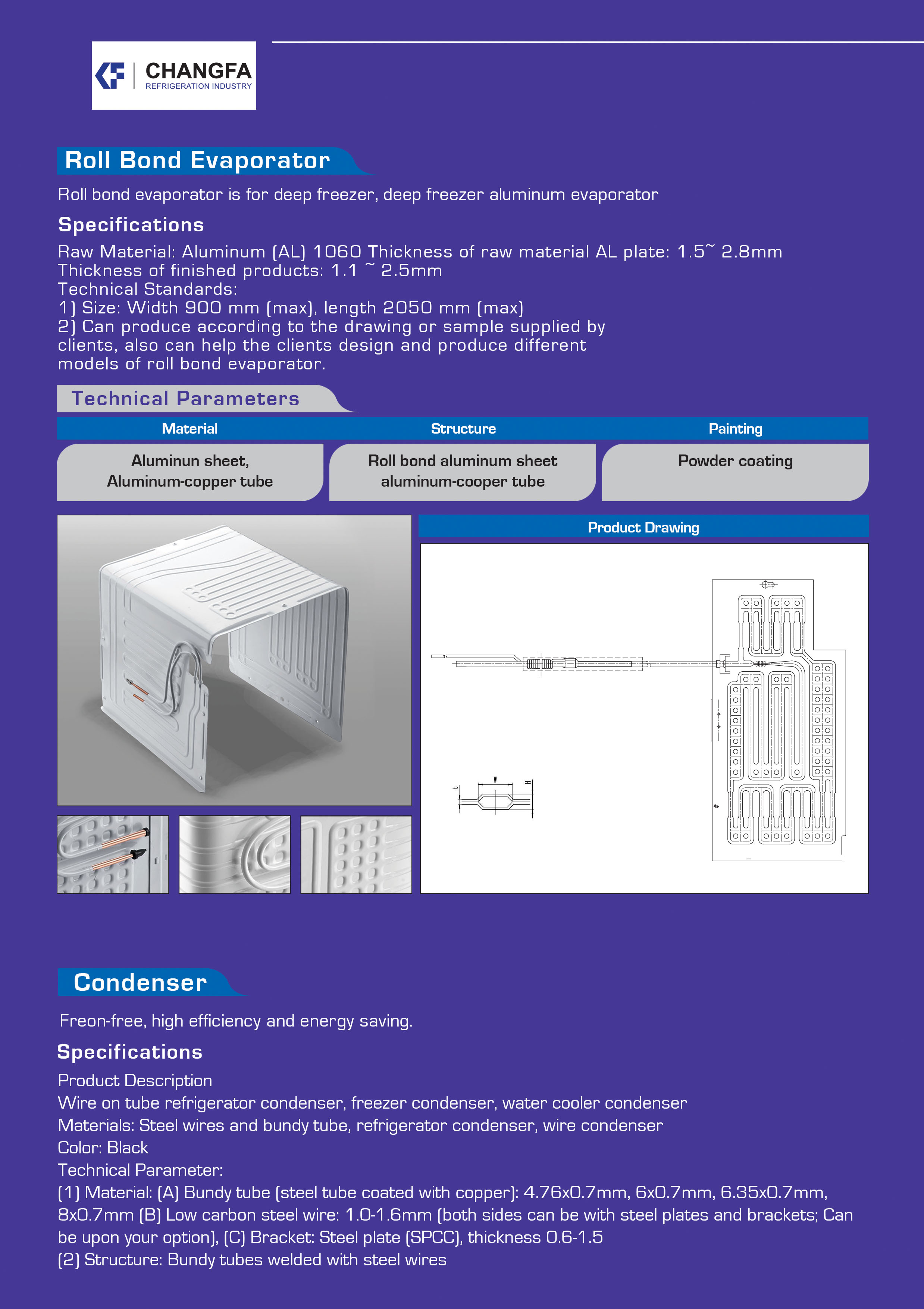 Ningbo CHANGFA Refrigeration Industry And Trade Co., Ltd was established in 2002, specializing in refrigerating components in refrigerators. The company is located in Cidong Indutrial Zone, Cixi, Ningbo, China. covering an area of more than 54000 square meters. Currently, we have more than 700 staffs, including 16 senior engineers. Our main products are including roll bond solar panels, roll bond evaporators, wire tube evaporators, plate evaporators, condensers and copper components. Our company has ability to research and develop independently with production of 12 million of annual production capacity.